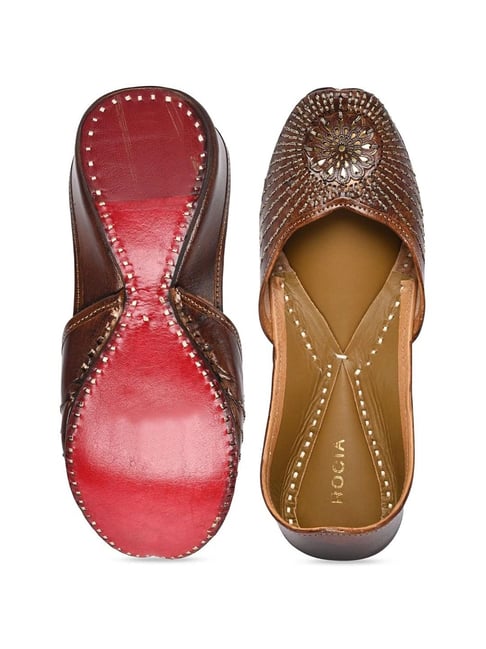 - These elegant brown leather juttis are a perfect blend of traditional craftsmanship and modern style. The upper is made from high-quality leather, featuring an intricate laser-cut floral pattern that gives the footwear a premium and eye-catching look. The inner sole is soft and cushioned, ensuring maximum comfort even during long hours of wear.
